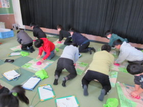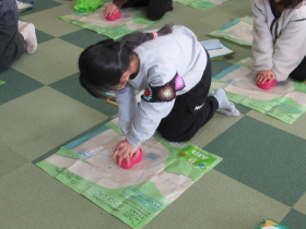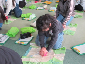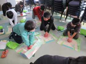 救急救命教室ではAEDについての使い方について学び、胸骨圧迫の実習を行いました。 子ども達は話を真剣に聞き、実習では胸骨圧迫の大変さを感じている様子でした。